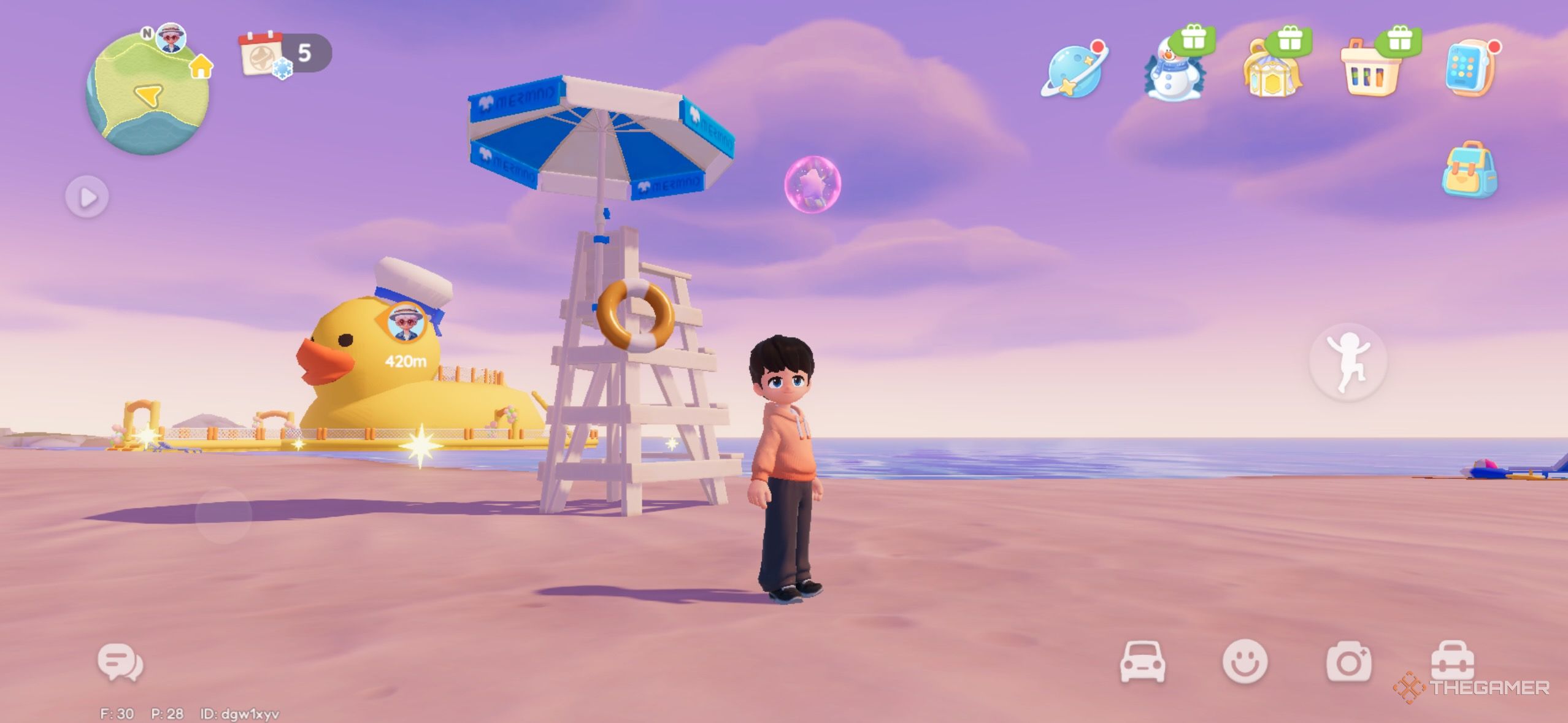 Вы можете найти розовый пузырь на Пурпурном пляже. Он парит рядом с шезлонгом спасателя. |