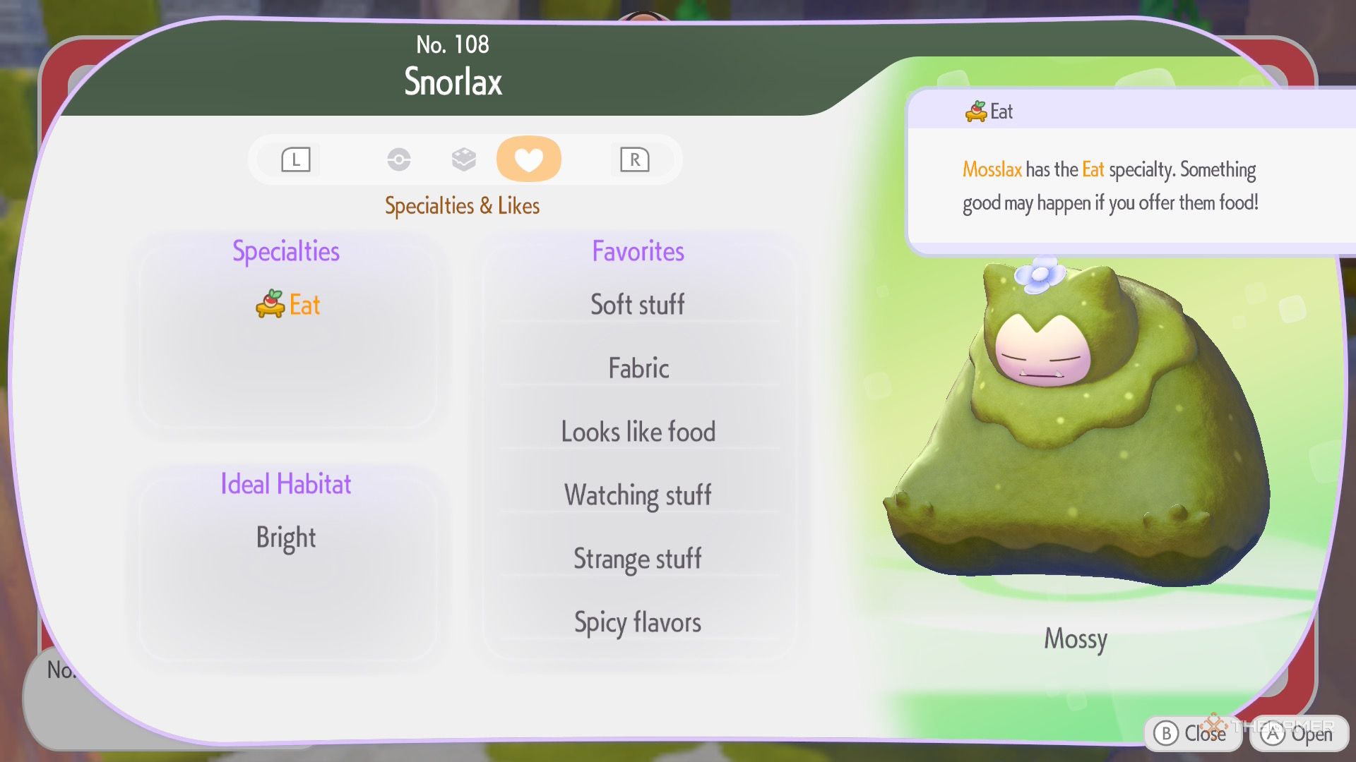 Способность Eat позволяет Мосслаксу наслаждаться едой, найденной в изысканной среде обитания, которая затем дает ему полезный эффект.