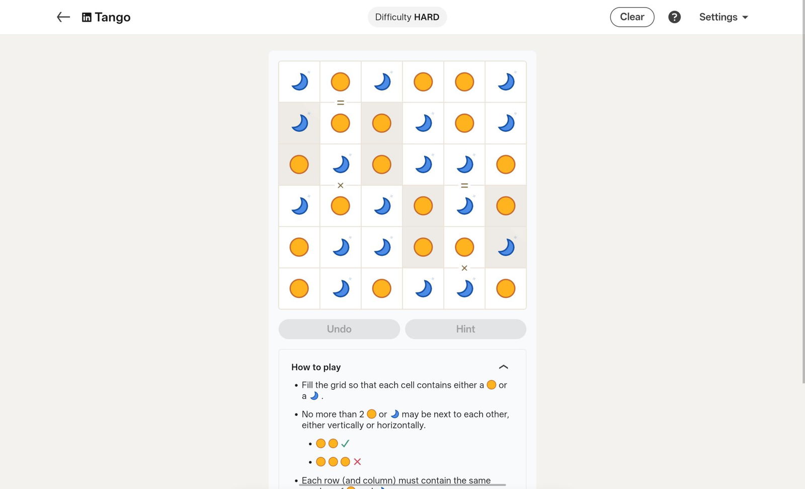 Головоломка Tango в настоящее время имеет восемь заполненных квадратов, и довольно просто заполнить оставшуюся сетку благодаря повторяющимся шаблонам квадратов, икс и знаков равенства.