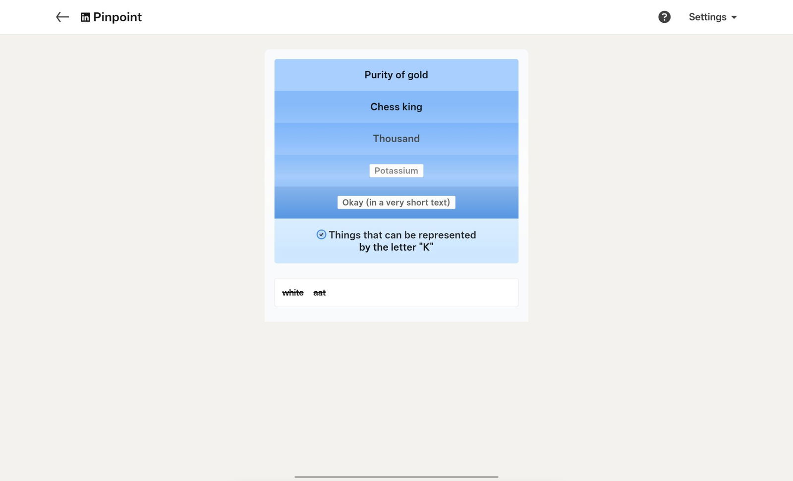 Сегодняшняя головоломка Pinpoint интересна – это хорошая задача, не слишком сложная, но и не слишком легкая. Первая подсказка – ‘Purity of gold’, которая может сразу дать ответ некоторым из вас. Вторая подсказка – ‘Chess king’, и если вы еще не движетесь в правильном направлении, она может вас сбить с толку.