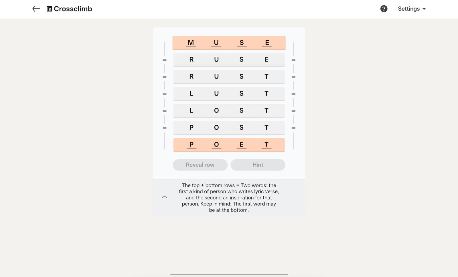 Вот решение для сегодняшнего LinkedIn Crossclimb: