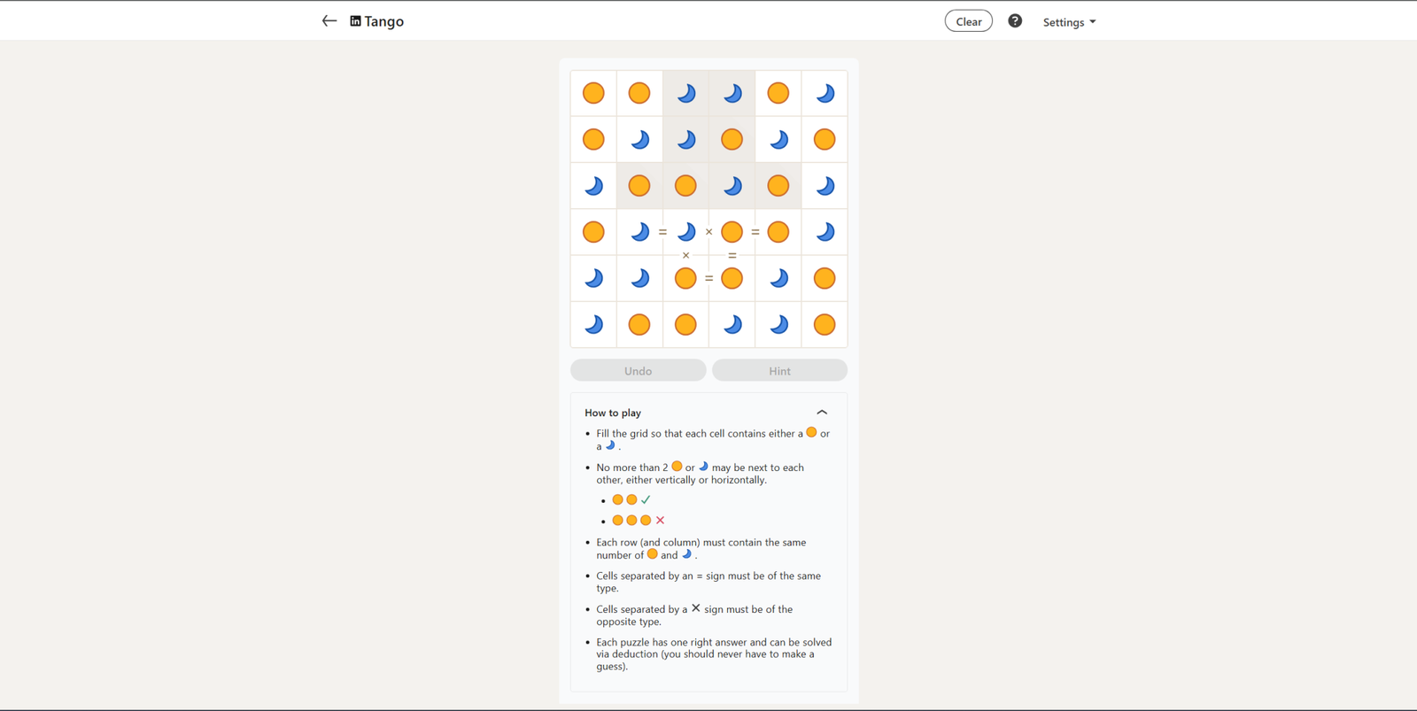 Сегодняшняя головоломка Tango проста. Она начинается с восьми уже заполненных квадратов, но это не делает её сложной. Как только вы решите несколько квадратов, остальная часть головоломки быстро складывается.