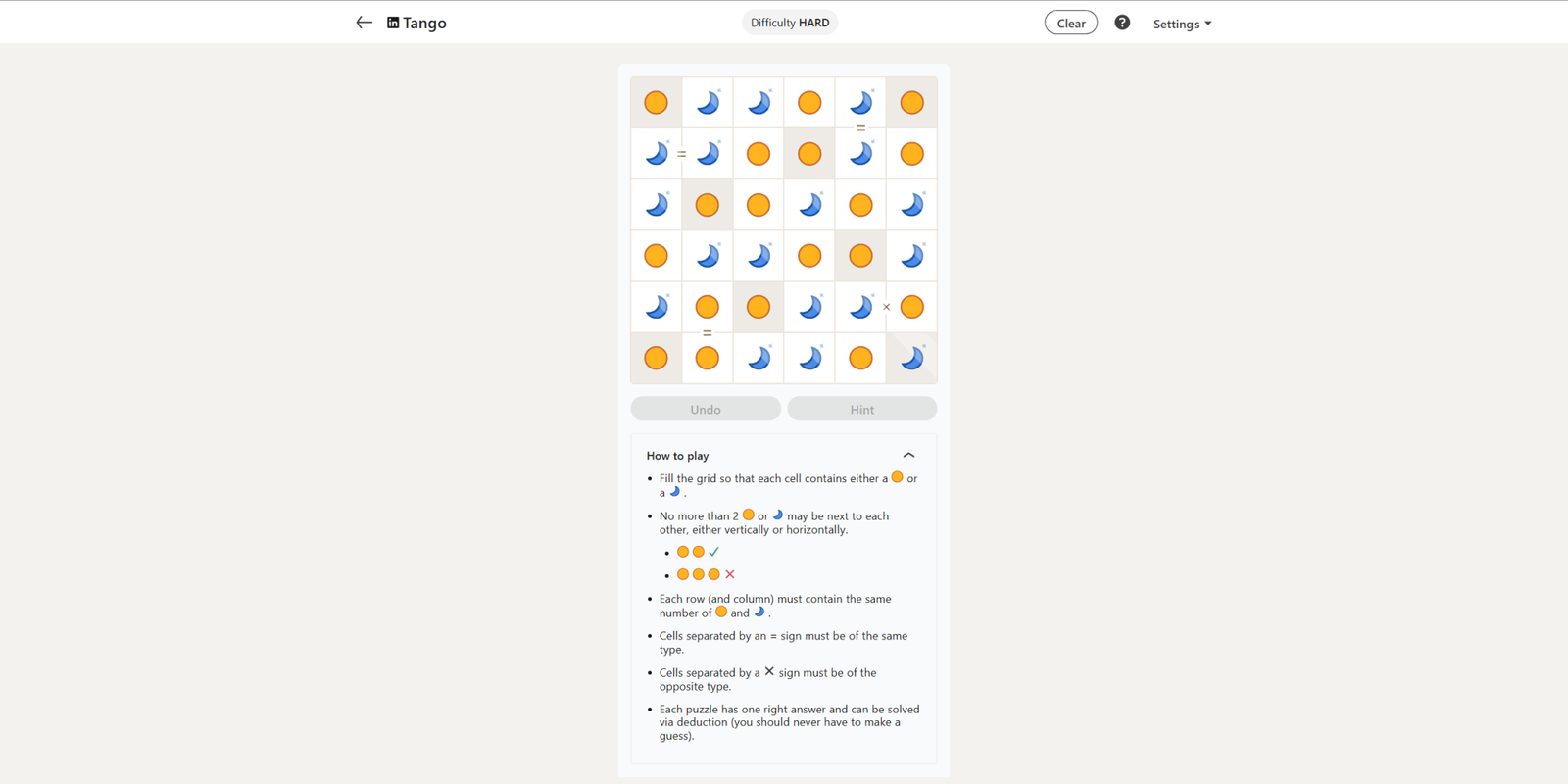Окей, сегодняшняя головоломка Tango на самом деле очень приятная! Уже заполнено восемь квадратов, что является хорошей отправной точкой, и ответы остроумные. Мне потребовалось немного времени, чтобы начать, хотя – первые несколько были определенно сложными!