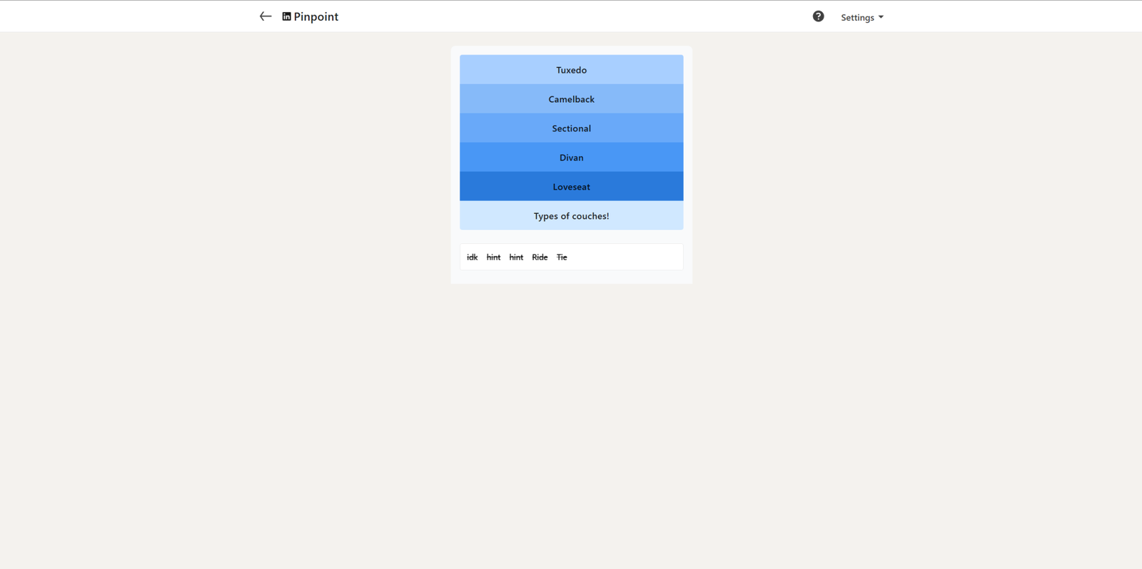 Давайте посмотрим на подсказки. Третья — ‘Sectional’, что может быть немного озадачивающим. Четвертая — ‘Divan’, и если вы знакомы с темой, это должно начать прояснять ситуацию. Наконец, у нас есть ‘Loveseat’. Сопоставив все вместе, ответ: Types of couches.