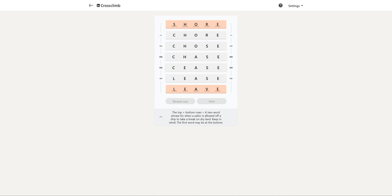 Вот решение для сегодняшнего LinkedIn Crossclimb: