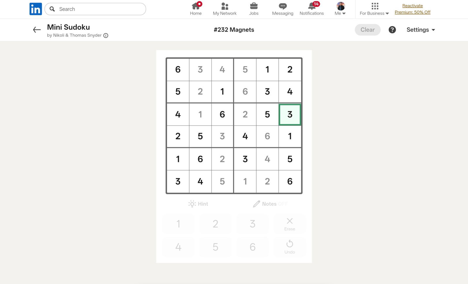 Решение LinkedIn Mini Sudoku за 31 марта 2026 года (#232)