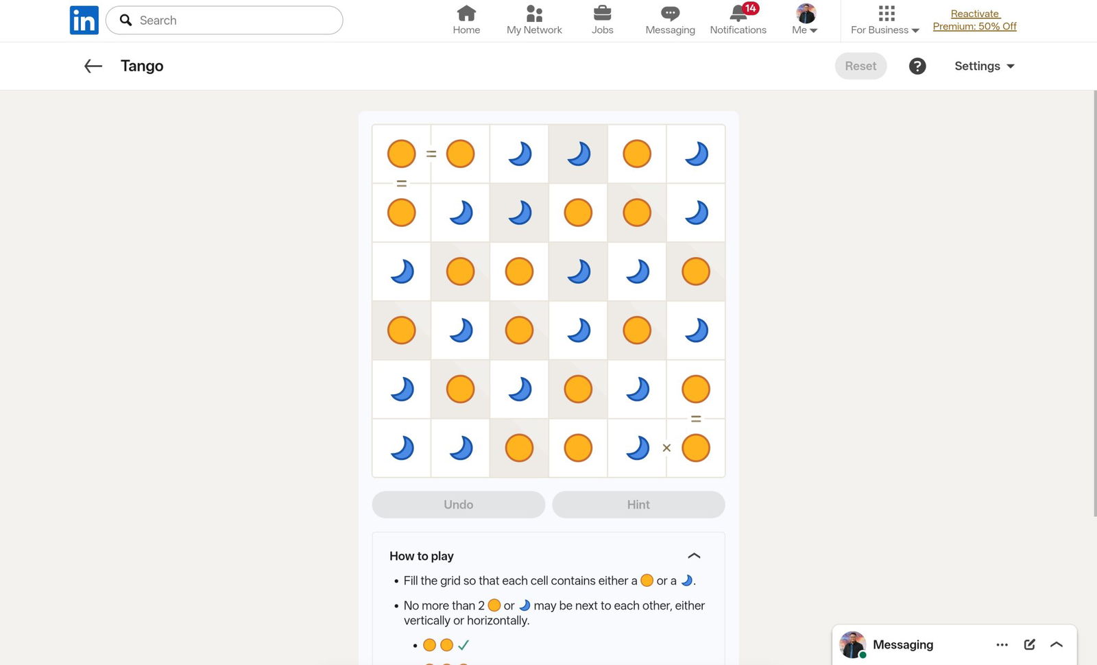 Сегодняшняя головоломка Танго довольно проста. Уже заполнено двенадцать квадратов, и подсказки в целом легко решить.
