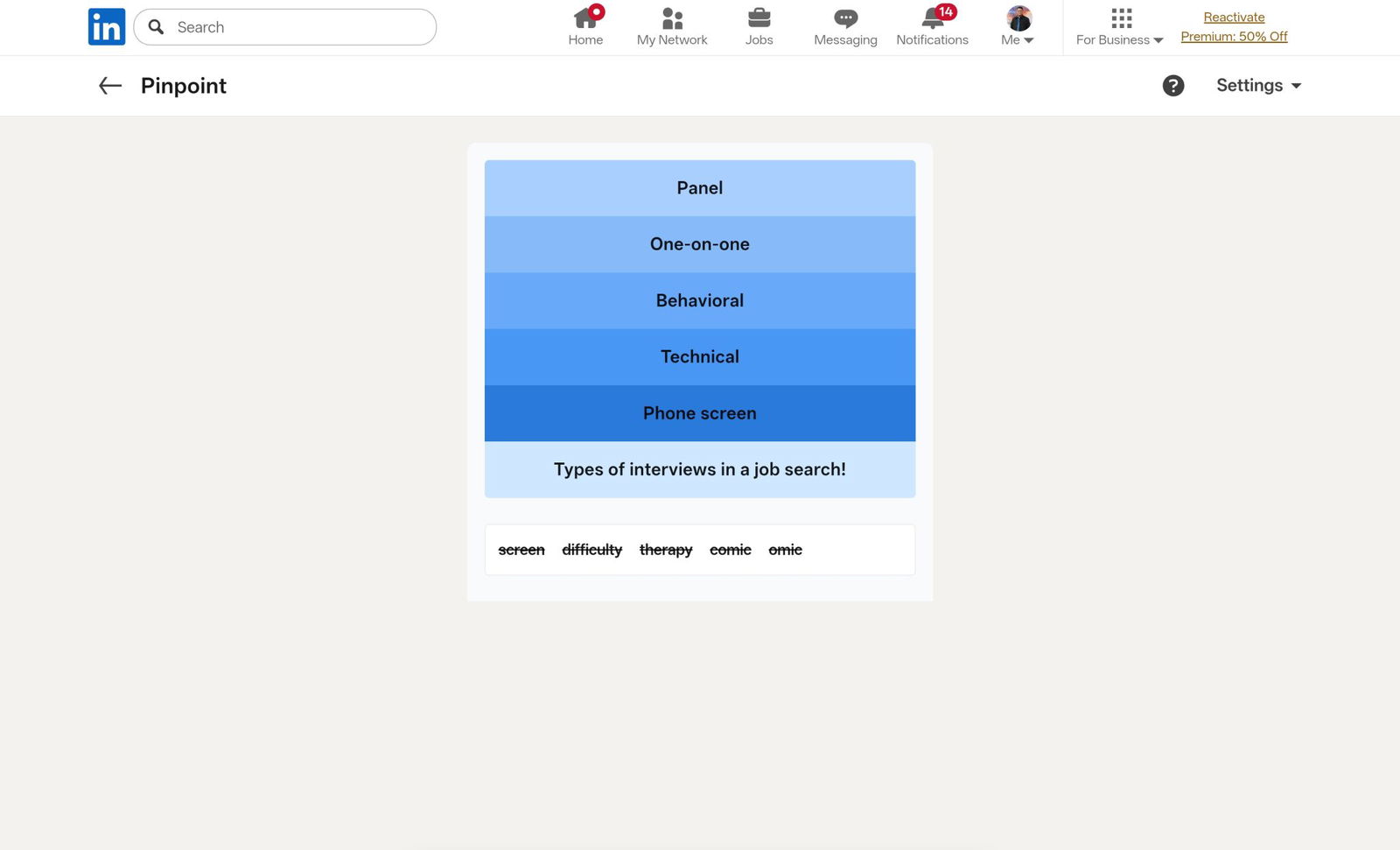 Четвертая подсказка связана с техническими навыками, что помогает сузить круг ответов. Последняя подсказка — ‘phone screen’, а ответ: различные виды собеседований, с которыми вы столкнетесь во время поиска работы!