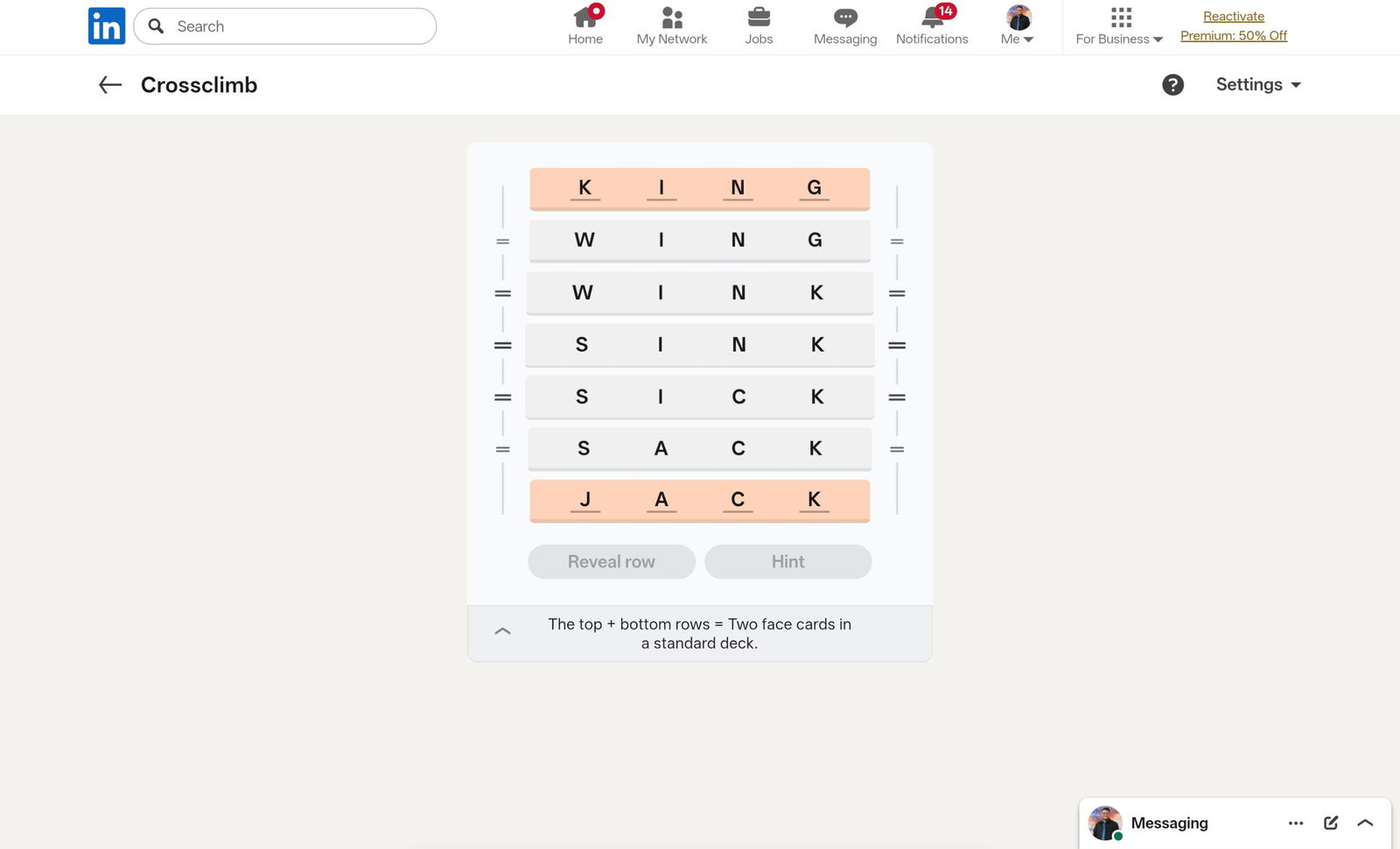 Вот решение для сегодняшнего LinkedIn Crossclimb: