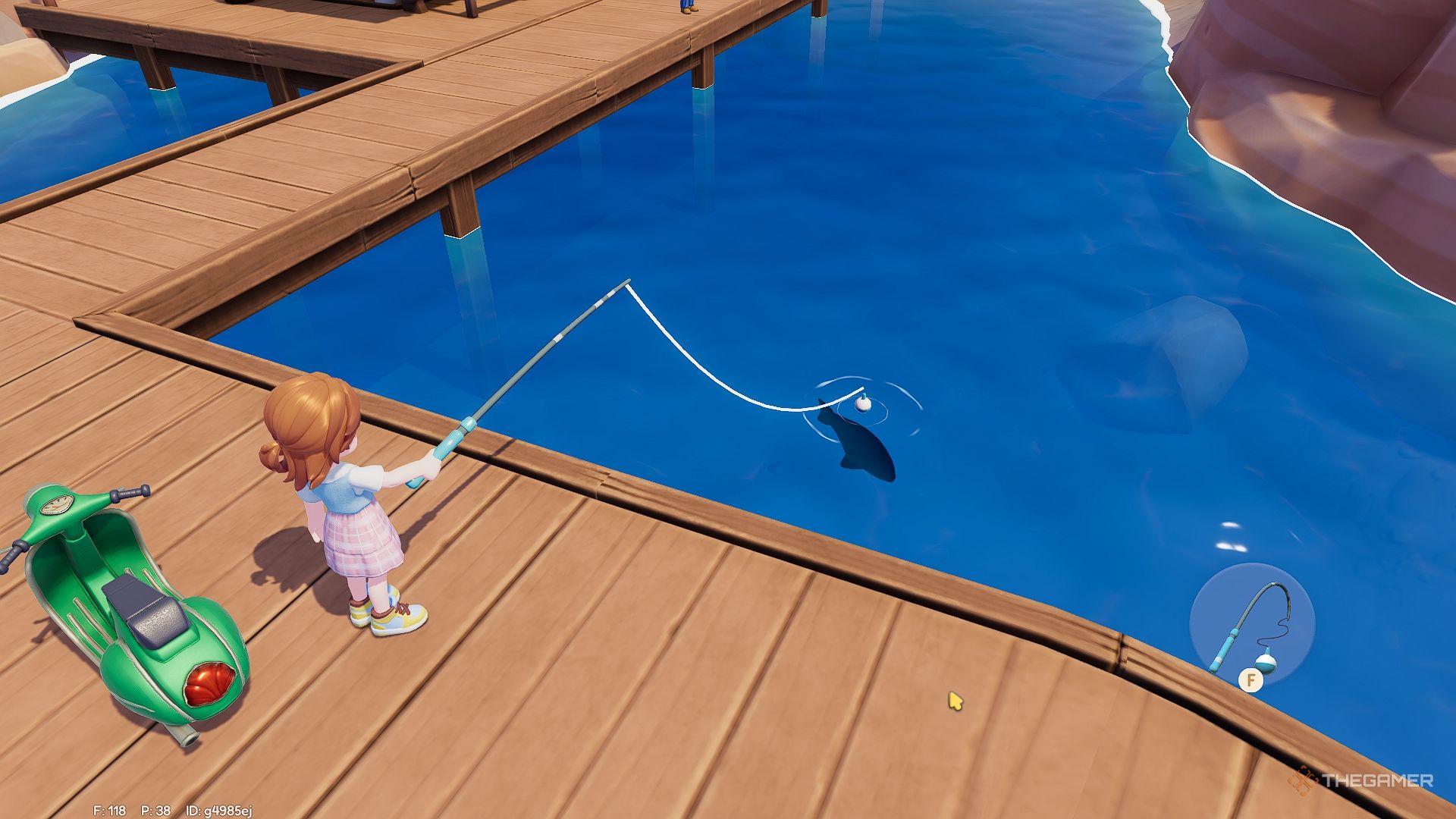 После того, как вы получите удочку во время обучения, вы можете исследовать весь остров, чтобы найти отличные места для рыбалки! Когда вы увидите рыбу, плавающую в воде, приготовьте удочку и нажмите, чтобы забросить леску.