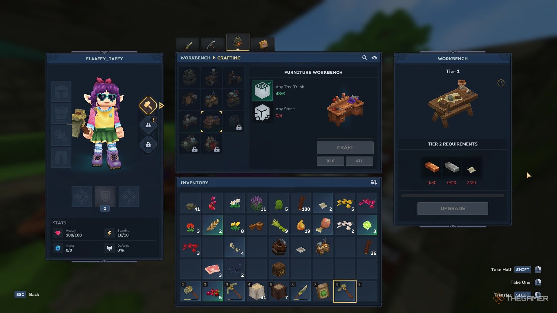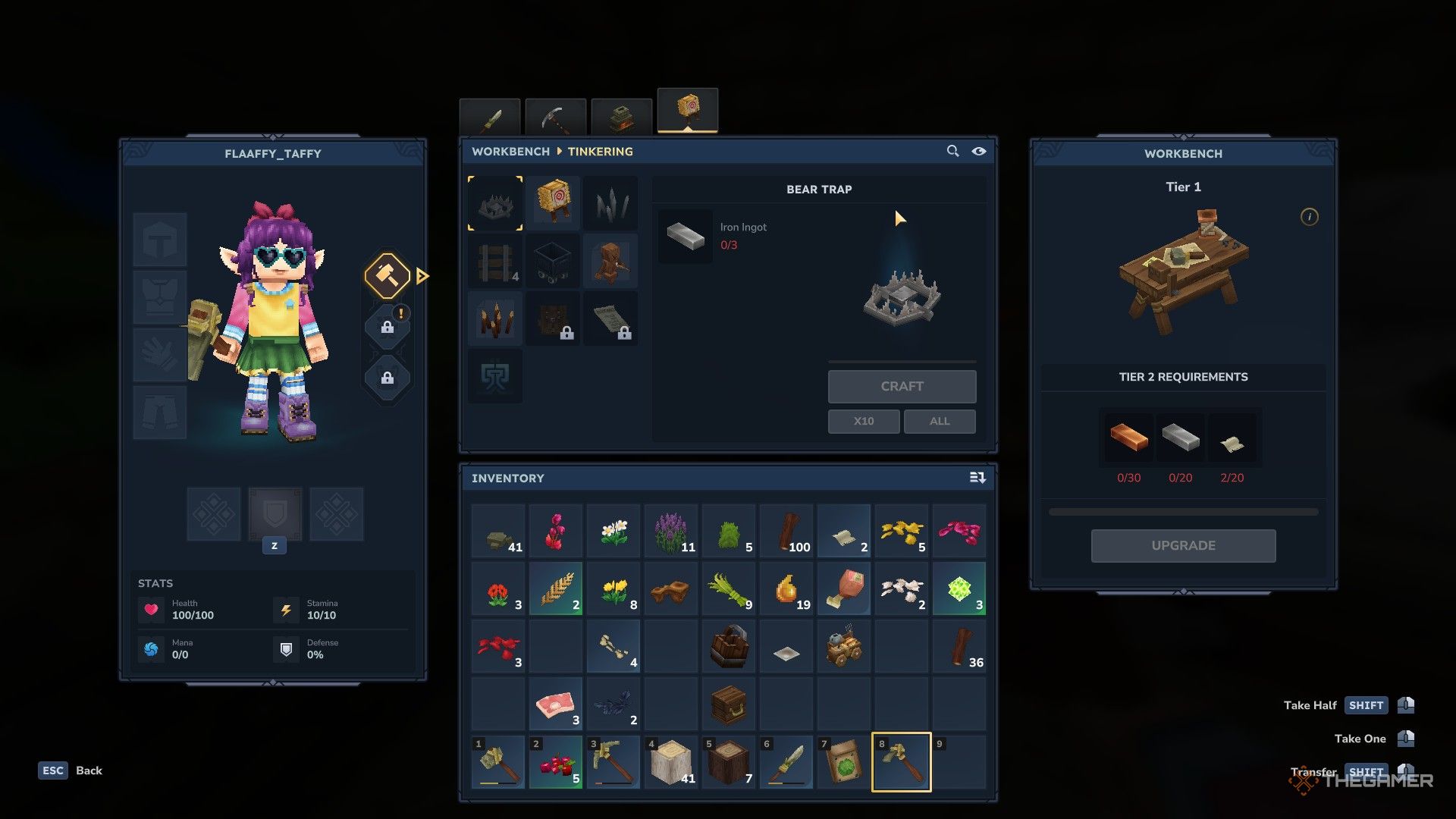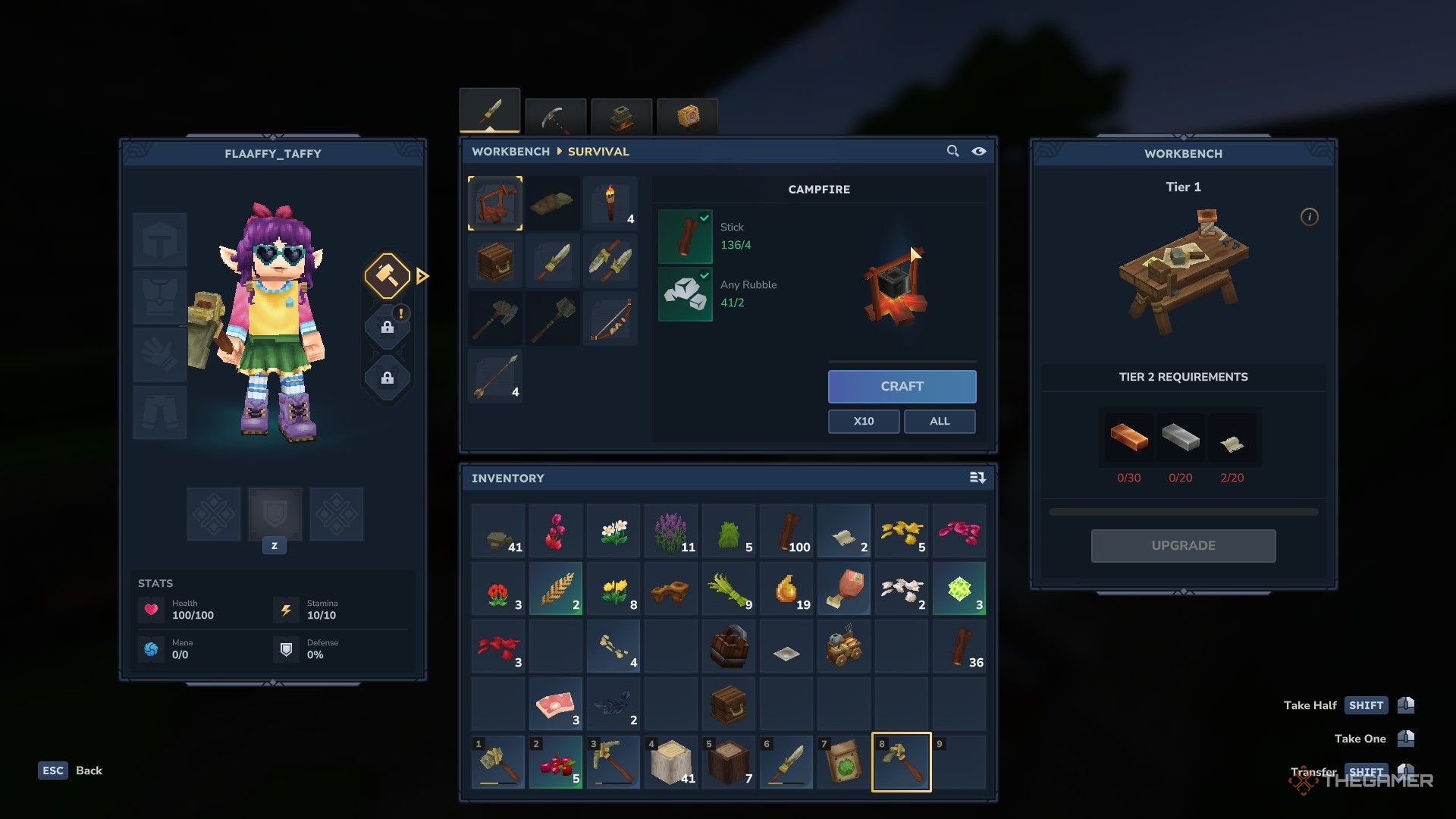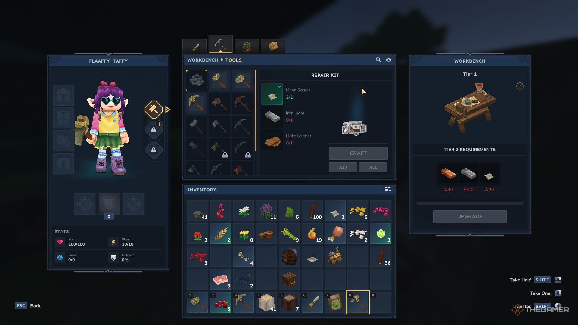 Меню Workbench вверху имеет четыре раздела: Survival, Tools, Crafting и Tinkering. Здесь вы в основном будете создавать предметы, такие как лучшие инструменты или оружие, а затем использовать их в игре. Раздел Crafting особенный, потому что он позволяет строить дополнительные станции для создания, которые открывают еще больше возможностей по мере вашего прогресса.