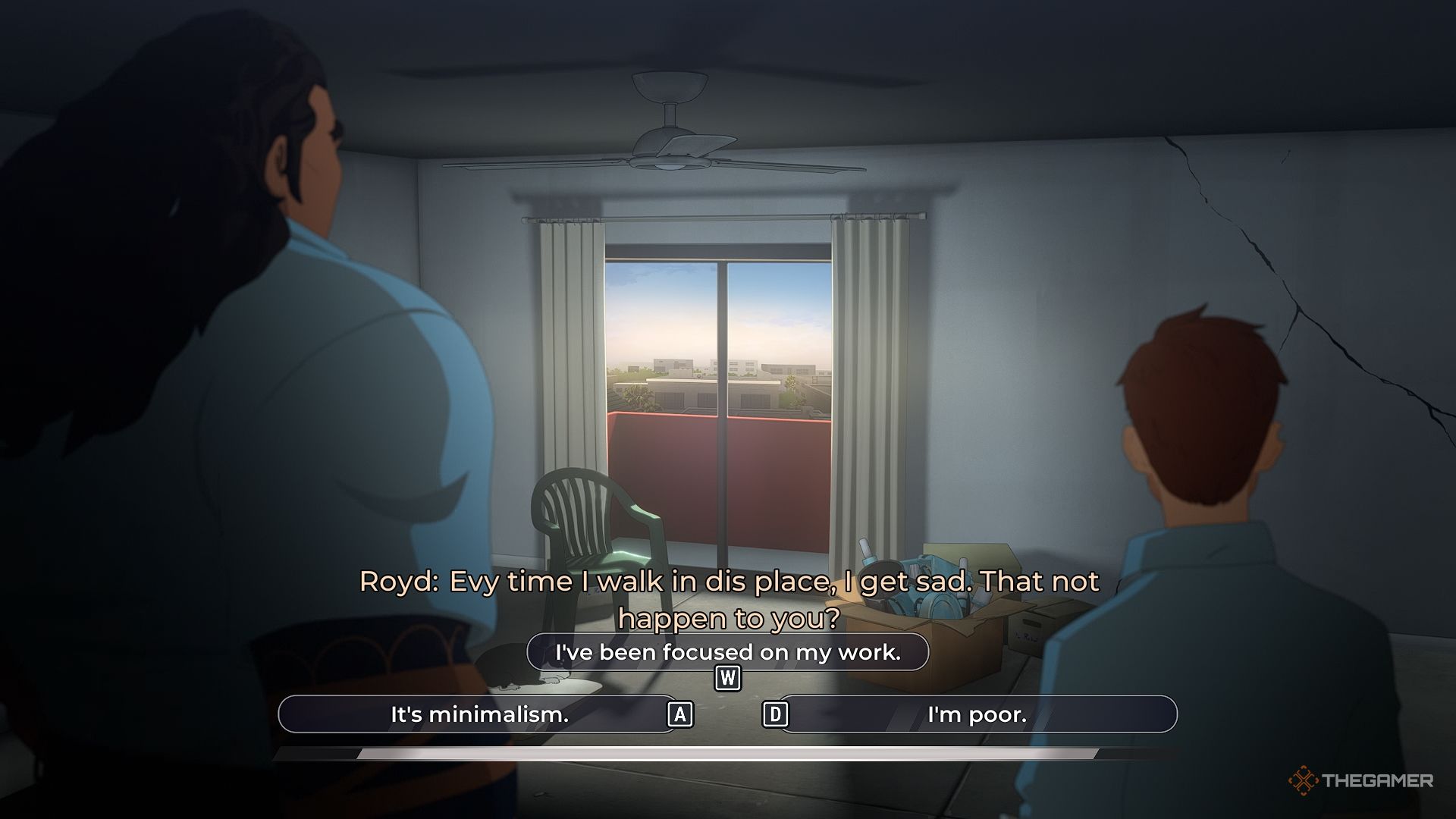 Лучший способ ей помочь — выбирать варианты диалога, которые подчеркивают её способность формировать своё будущее, так как это может изменить её точку зрения. Когда в конце смены появится последнее дело, поощряйте её взяться за него — это может стать решающим фактором между потерей работы и получением новой возможности.